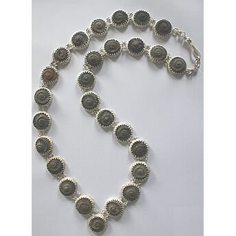Sudarsan shaligram of small size around the diameter of 16mm size is designed in silver to make the necklace. Good for offering to Lord Krishana Temple around your place.